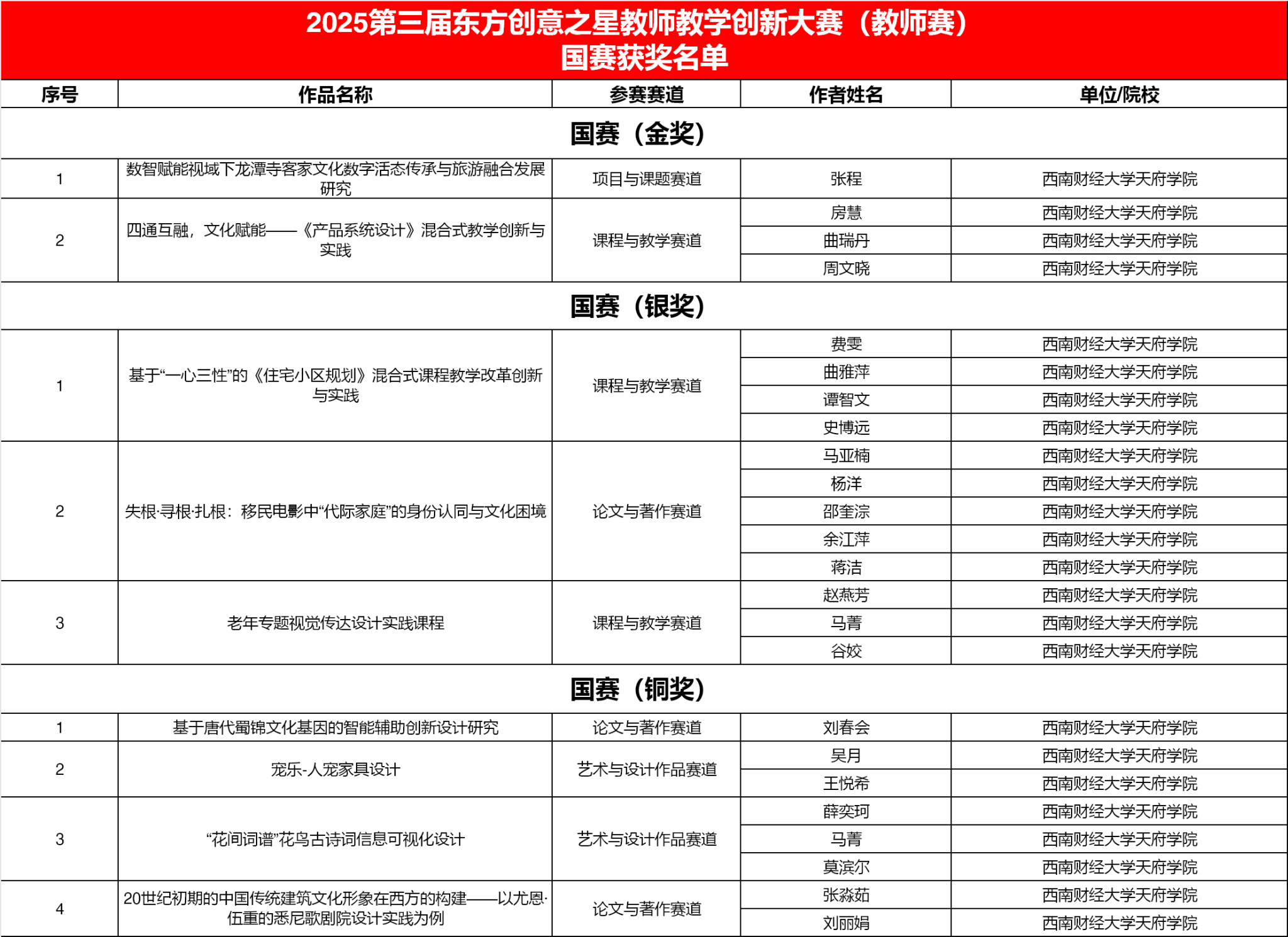 2025第三届东方创意之星教师教学创新大赛(教师赛)国赛获奖名单于近日公告出炉,西南财经大学天府学院艺术与传媒学院积极参赛,最终荣获金奖2项,银奖3项,铜奖4项,省赛(四川赛区)特金奖4项,金奖5项,银奖11项,铜奖7项。