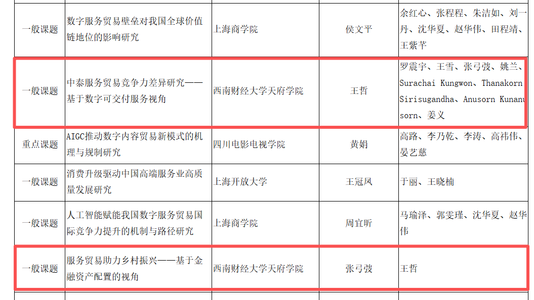 2025年9月,中国服务贸易协会发布了《2026年度中国服务贸易协会研究课题申报指南》,重点围绕现代服务业和服务贸易领域的社会热点、发展痛点难点与政策堵点问题,提出多个选题方向。结合学校科研标志性成果要求,基于学院有组织科研基础,紧紧围绕学科建设重点,智能金融学院积极组织中青年教师申报,取得突破。经中国服务贸易协会专家评审,《数字文创驱动服务贸易高质量发展的路径与政策研究》(主持人:姚一永)、《中泰服务贸易竞争力差异研究——基于数字可交付服务视角》(主持人:王哲)以及《服务贸易助力乡村振兴——基于金融资源配置的视角》(主持人:张弓弢)成功获批2026年度中国服务贸易协会研究课题立项。