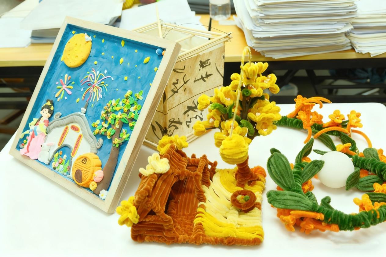 决赛现场,选手们依次手持作品登台,从创作灵感、制作细节到文化内涵娓娓道来。他们的讲述既有对传统中秋元素的当代演绎,也有对团圆情感的细腻表达,展现出深厚的文化理解与艺术巧思。一位同学以环保材料复原古法灯笼,在传承技艺的同时融入现代设计理念,造型别致,意蕴悠长;另一位同学则通过精心绘制的手抄报,将“嫦娥奔月”“玉兔捣药”等经典传说以图文并茂的形式重新演绎,画面生动,故事感十足;还有同学运用黏土塑造出玉兔、明月与桂花树组成的中秋微景,搭配自制灯光底座,在光影交错间营造出静谧而温馨的节日氛围,引人入胜。
