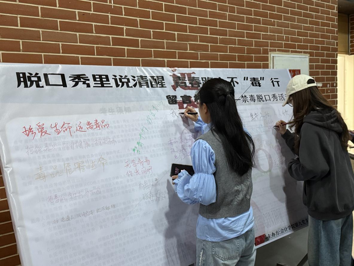 本次禁毒活动巧妙融合了脱口秀的幽默表达与创作墙的互动参与,将“识毒、防毒、拒毒”的意识深植学生心中。活动不仅传授了辨识毒品的实用技巧,更传递了健康生活的积极理念,既是一次校园育人模式的生动实践,也是一份守护青春成长的温暖答卷。今后,天府学子将携手同行,共同守护无毒校园。