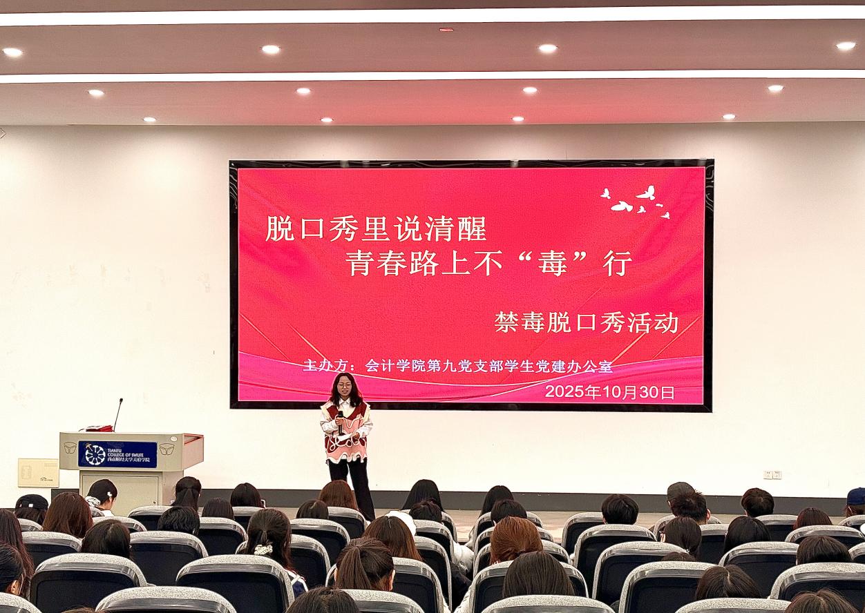 为筑牢青年学生拒毒防线,10月30日,西南财经大学天府学院会计学院第九党支部在德阳校区报告厅B301举办“脱口秀里说清醒 青春路上不‘毒’行”主题禁毒活动。本次活动以寓教于乐的形式,为现场200名学生开展了一场生动的禁毒教育。