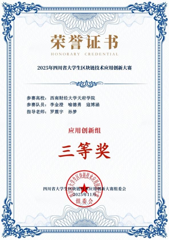 为深入贯彻落实国家关于加快数字化发展与创新人才培养的战略部署,推动区块链技术在教育与产业领域的融合应用,提升大学生科技创新与实践能力,由四川省教育厅及相关单位联合主办的“2025年四川省大学生区块链技术应用创新大赛”于近日圆满落幕。此次比赛由西南财经大学天府学院智能金融学院牵头组织,各学院学生积极参与、奋勇争先,经过校赛选拔,本科3支队伍进入省赛,最终2支队伍获得省级三等奖。