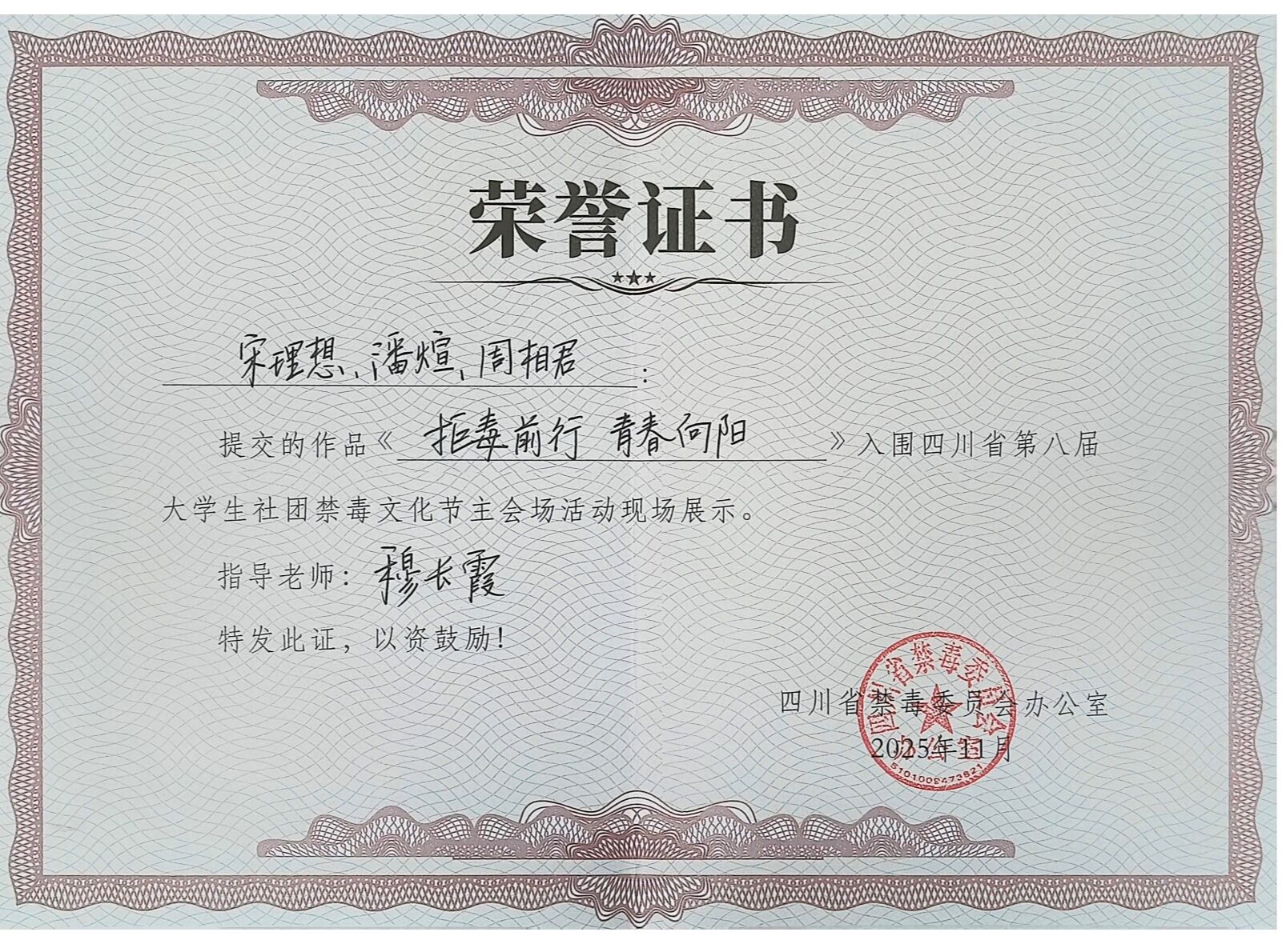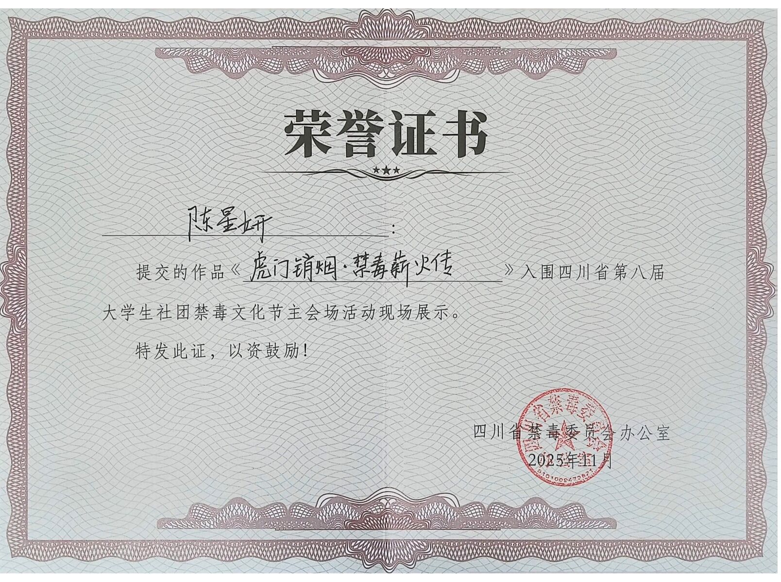 近日,四川省第八届大学生社团禁毒文化节“禁毒 +”作品征集活动圆满落幕。西南财经大学天府学院学子凭借扎实的创作功底与深刻的主题表达斩获佳绩,共有3件原创作品成功入围省级展示名单,充分展现了学校禁毒教育与艺术实践融合的丰硕成果。