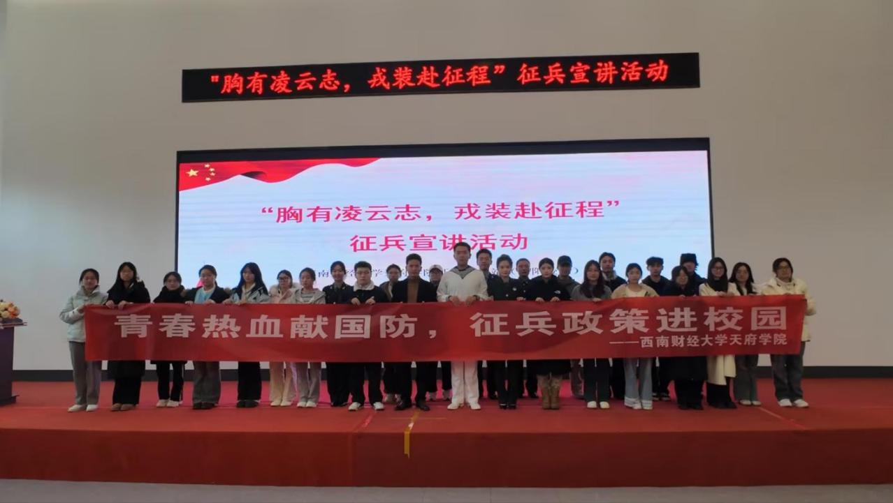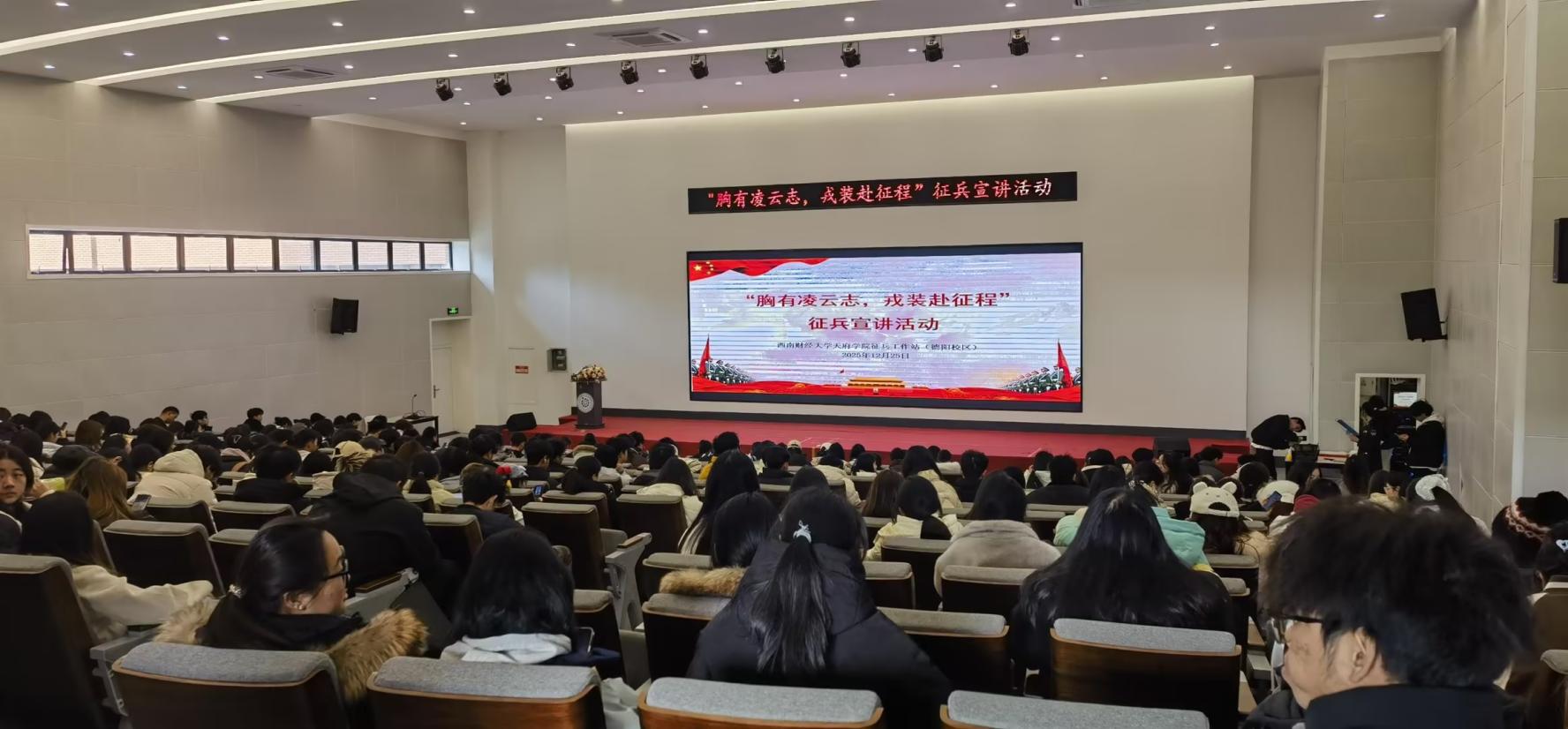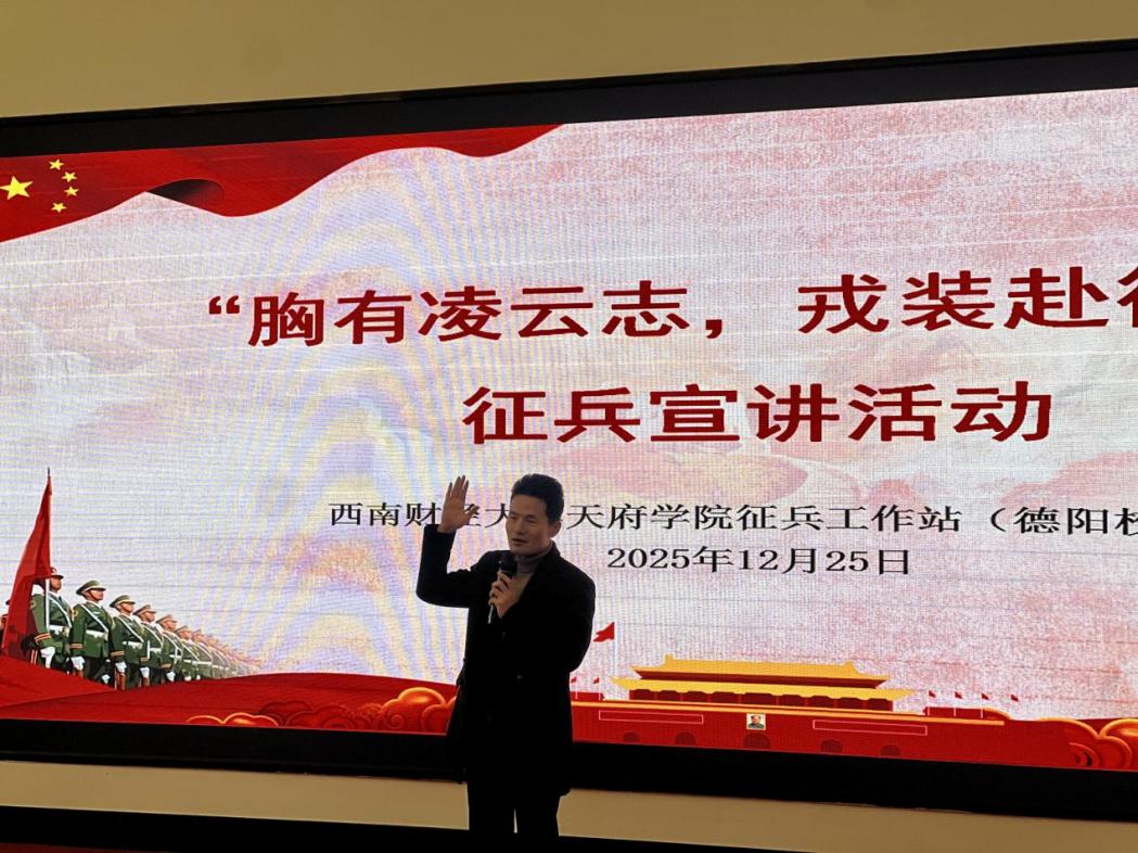 近日,由西南财经大学天府学院征兵工作站组织的“胸有凌云志,戎装赴征程”征兵宣讲活动在德阳校区C203报告厅顺利开展。党委学生工作部副部长严飞雷、学校征兵工作站副站长邱长江、会计学院国防教育负责老师袁海航、康养护理学院国防教育负责老师李婷参加活动。本次活动面向全校学生,围绕征兵政策、军旅生活等内容展开宣讲。