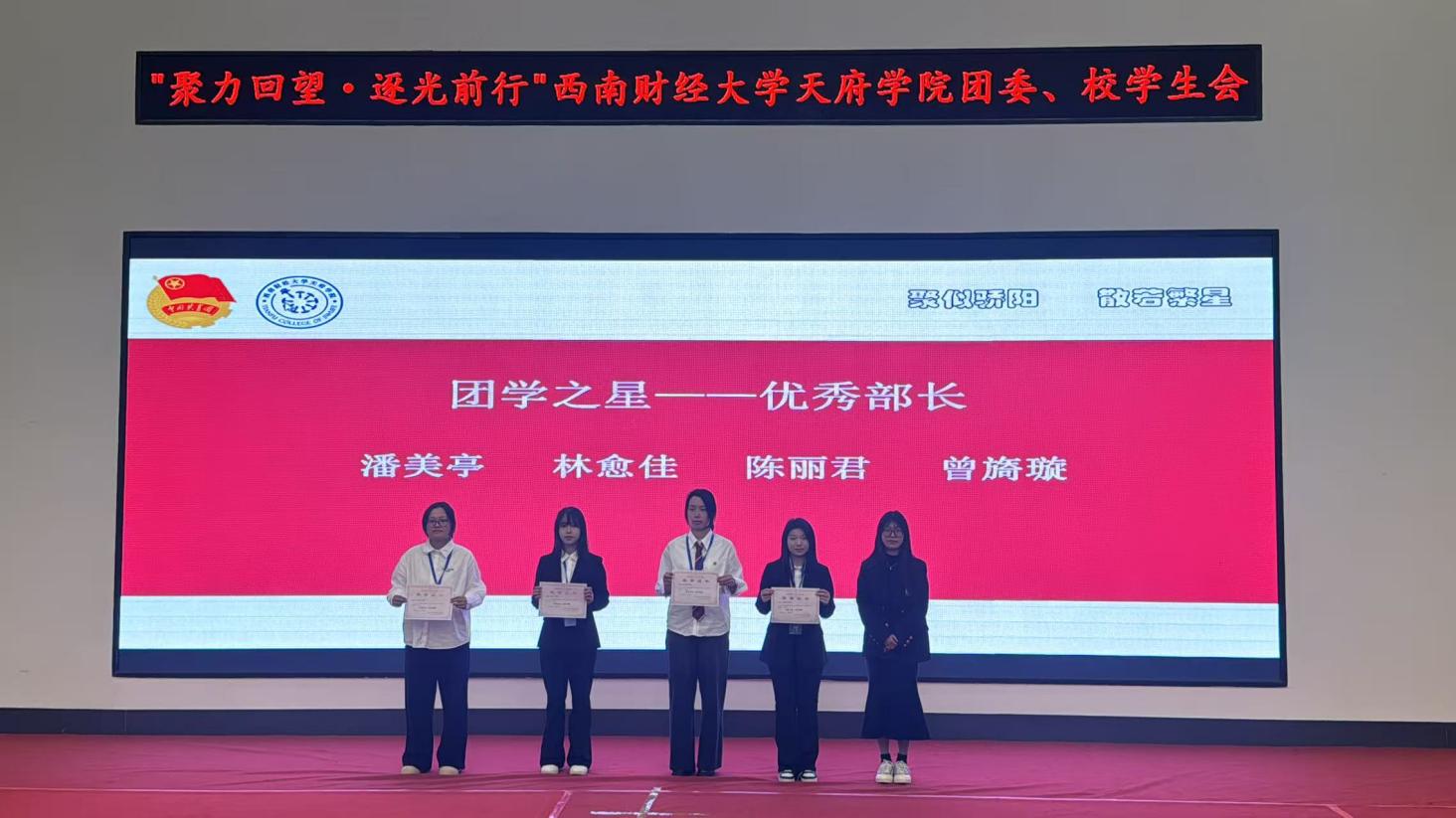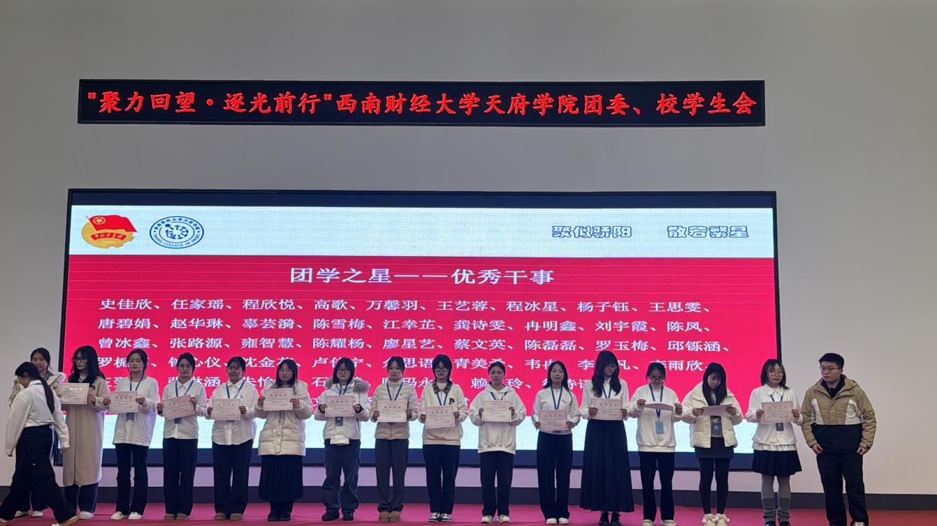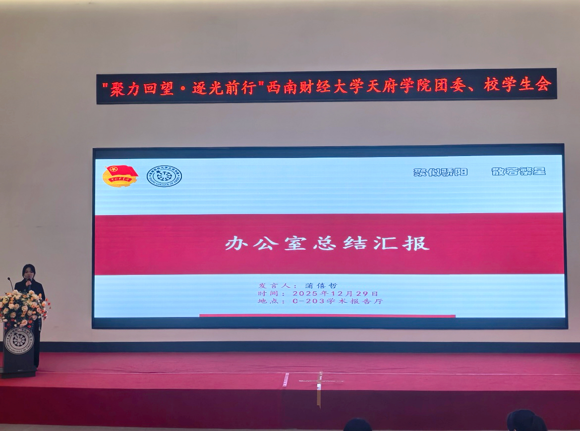 岁末将至,收官在即。2025年12月29日,“聚力回望·逐光前行”西南财经大学天府学院团委、校学生会2025年秋季学期工作总结大会在德阳校区C203顺利召开。校团学300余名团学干部、艺术团成员同受邀的会计学院、艺术与传媒学院书记处、主席团代表一同参会。团委副书记车学文,团委心理素质拓展中心指导老师范兴娴,学校心理健康教育中心老师邱长江参加总结会议。