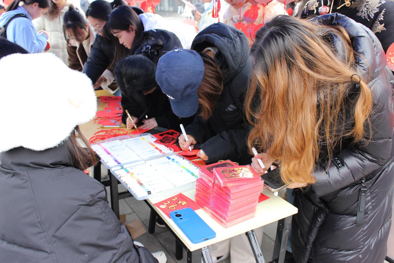 笔墨含情,联语寄心。汉服社与雷锋站联袂,铺展红纸、研墨挥毫。同学们书写“福”字融入百福长卷,亦可借鉴或自创对联,以“书山筑梦”“学海扬帆”等句抒发新年壮志。一横一竖凝祝福,一撇一捺书新愿,让翰墨清香伴随大家共迎春光。