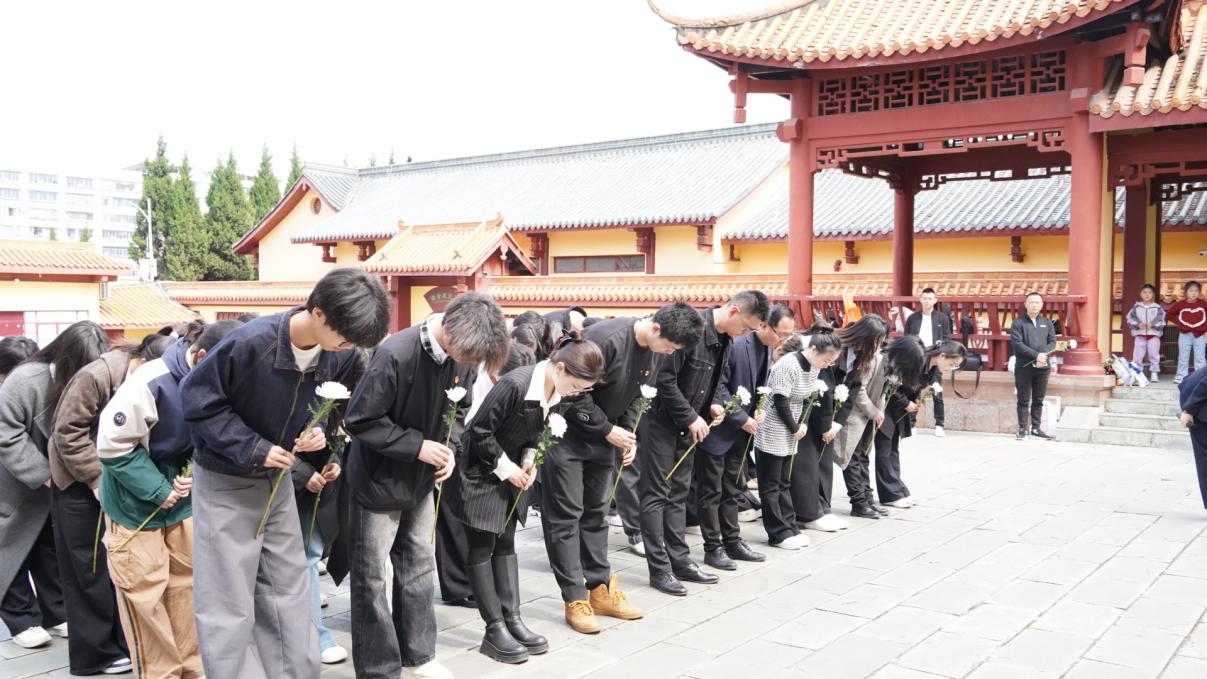活动当天,师生怀着崇敬之情走进黄继光纪念馆。在庄严肃穆的祭奠仪式上,全体人员整齐列队、肃立默哀,向为国家和人民献出生命的黄继光烈士致以崇高敬意与深切缅怀。默哀毕,师生依次敬献鲜花,在哀思中重温英雄“舍生忘死、保家卫国”的气概,感悟革命先烈的家国担当。