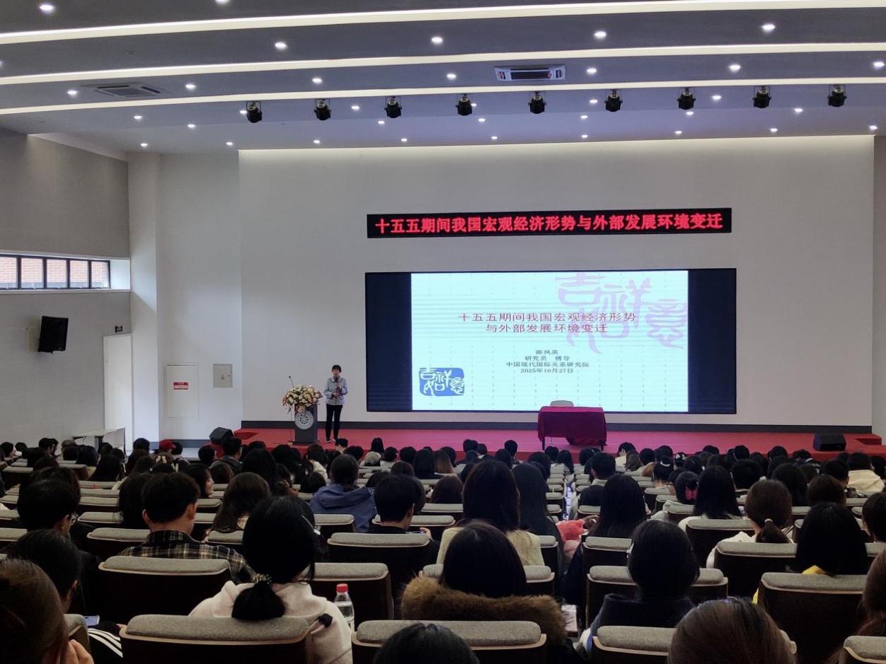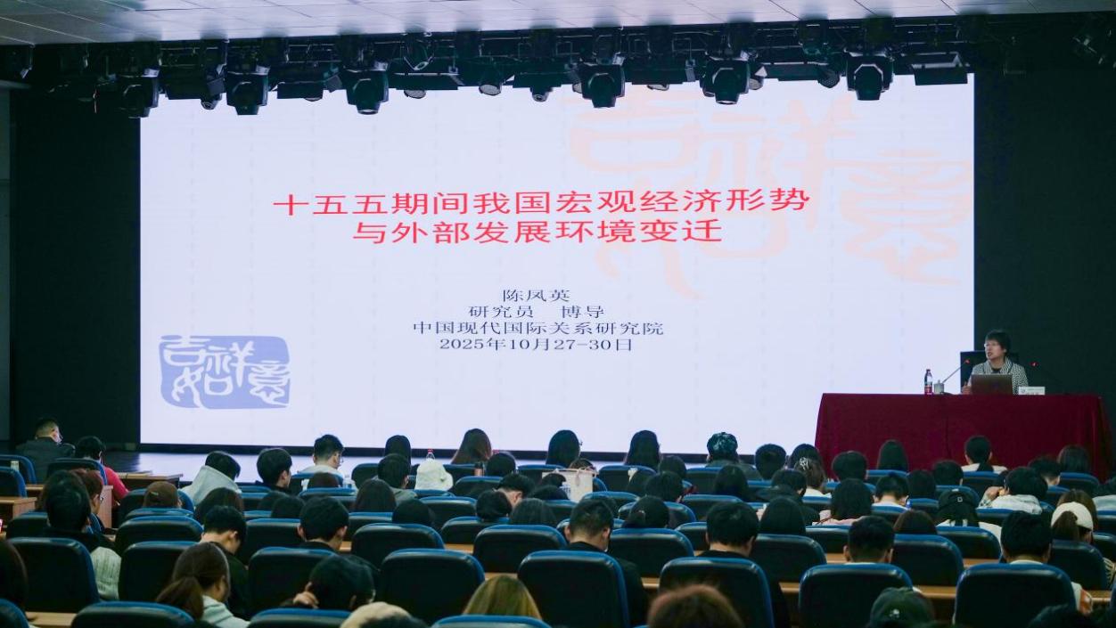 此次讲座,陈凤英立足国际大视野深入讲解“十五五”期间我国宏观经济发展总趋势,用专业数据和鲜活案例分析全球大国经济博弈的历史演进和未来发展,解读“十五五”时期我国经济社会发展必须遵循的原则,引导师生增强“四个意识”、坚定“四个自信”、做到“两个维护”。