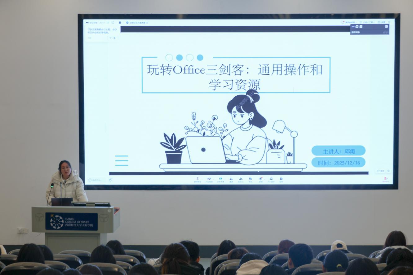为帮助学生提升办公软件应用能力,西南财经大学天府学院会计学院班主任秘书处联合团总支、学生会学术部,于12月16日晚在德阳校区B101教室成功举办“班主任领航系列”之“玩转Office,办公效率倍增”专题讲座。主讲人邱霞老师凭借《财务机器人应用》《会计信息系统开发》等前沿课程教学经验,结合主持《财务数智化导论》课程建设的专业积淀,深度解析Office高阶应用技巧。本次讲座吸引了德阳校区240余名学子参与。