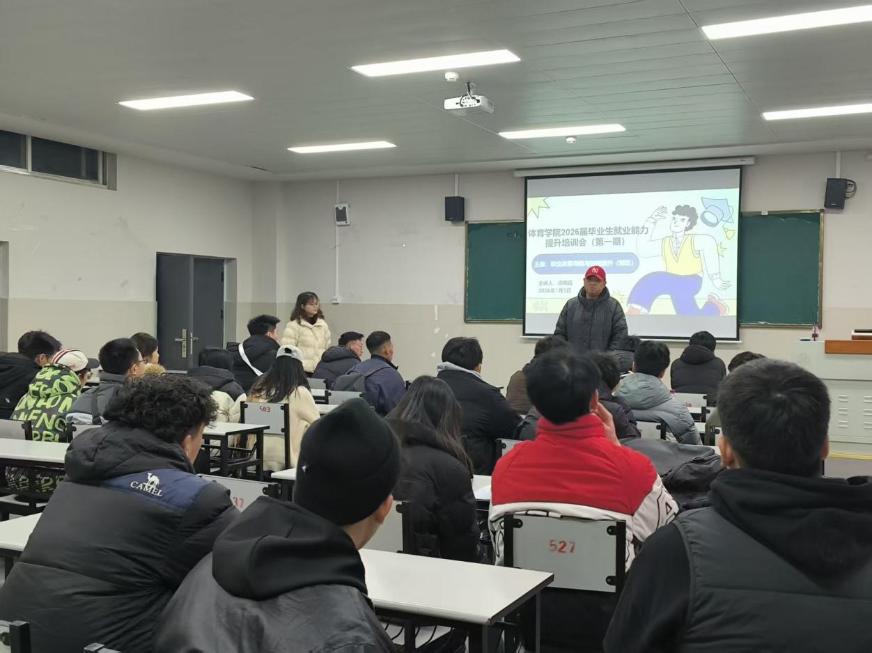 为精准对接毕业生求职需求,破解就业规划困惑,提升职场核心竞争力,2026年1月5日下午,体育学院(成都校区)2026届毕业生就业能力提升第一期培训会顺利开展。体育学院辅导员徐晓霞担任主讲人,体育学院党总支书记李峰出席并作开讲动员。