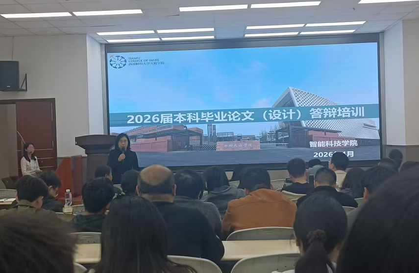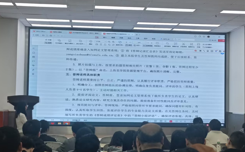 为强化毕业设计(论文)质量管控,确保2026届本科毕业答辩工作规范有序开展,4月1日下午,智能科技学院在实验楼110召开了2026届毕业论文答辩工作培训会。此次培训会由学院教师杨晓欢主讲,学院副院长陈小宁出席会议,学院全体答辩成员参会。