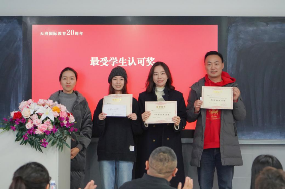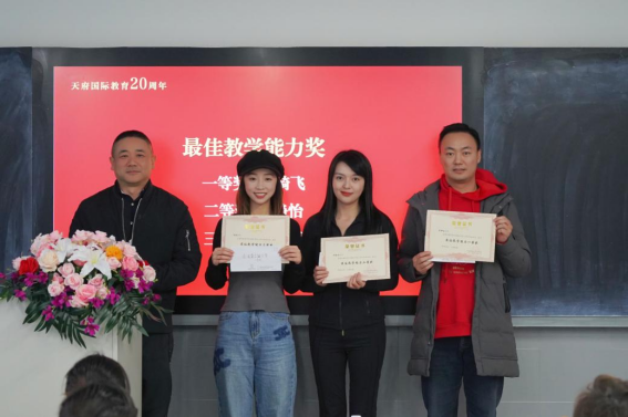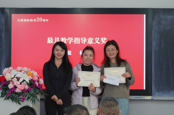 为最佳教学能力奖获得者周琰、钟静怡、李漪飞颁奖
