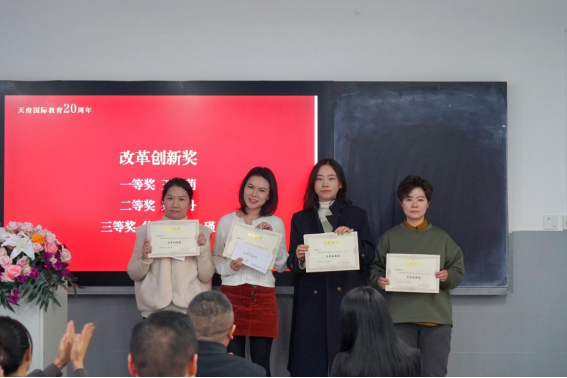 为改革创新奖获得者曾小瑾、徐谊、王萌、梁宝丹颁奖