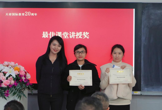 为最佳课堂讲授奖获得者王雪梅、曾小瑾颁奖