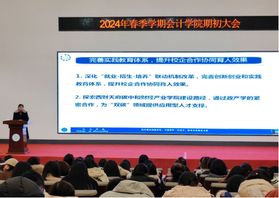 3月2日下午,会计学院在德阳校区C203报告厅召开了2024年春季学期全体教职工期初大会。会议由会计学院院长陈真子主持,学院党总支副书记孟仁丹、林琳、夏丹、副院长许静、院长助理陈茜、张娟及学院全体教职工参加。会议围绕“贯彻落实立德树人根本任务、学校教育教学思想和人才培养理念以及人工智能背景下的‘大改、中改、小改’的有效开展”这三项主题,总结了2023年的工作,并就2024年重点工作进行了部署。