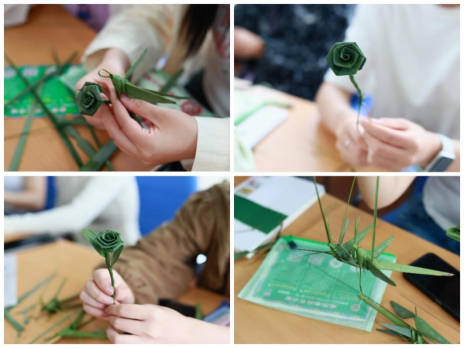 江福容从羌族草编的起源、发展历史到编制方法进行了介绍,同时,两位传承人分别对编制的“蚂蚱”和“玫瑰花”的基本编制手法做了详细的讲解,并手把手指导同学们进行现场编制。