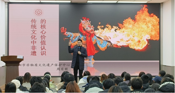 12月14日晚,文化与教育学院在实验楼110室开展了以“传统文化中非遗的核心价值认识”为主题的文教讲堂。本次讲堂由四川传统文化中心、西南财经大学天府学院绵阳校区图书馆联合主办,文化与教育学院团总支、学生会承办,主讲人为西南财经大学天府学院客座教授、绵阳市非物质文化遗产保护中心创编部副主任周有燚讲授。嘉宾分别是学校图书馆馆长伍红梅、副馆长武同雁、管理员王丽、四川传统文化中心主任沈德存、文化与教育学院教师唐莹、刘洋,共计200名学生参加。