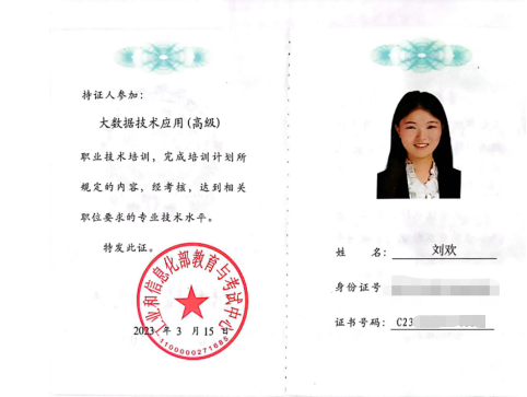 为贯彻落实人力资源和社会保障部《关于健全完善新时代技能人才职业技能等级制度的意见(试行)》的精神,提升我校教师大数据、人工智能专业技能水平。1月15日,我校郑婧老师和刘欢老师参加了工业和信息化部人才培养工程考试,并于5月28日成功取得大数据技术应用(高级)证书。