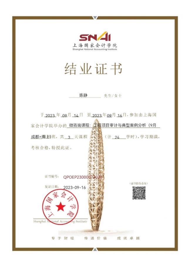 为进一步提升工程审计师资团队的专业水平,以更好地服务学生的教学与科研,9月14日至16日,建筑与工程学院选派专业负责人陈静参加由上海国家会计学院举办的“微咨询课程:工程项目审计与典型案例分析”研修班,并通过考核获得结业证书。
