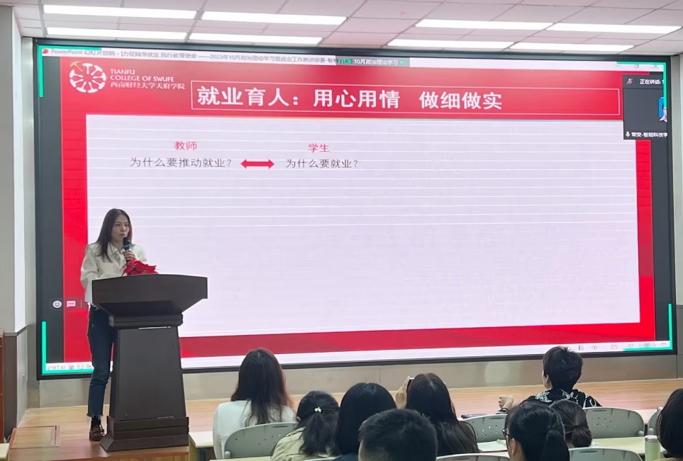 接着,学院第一党支部书记陈倩讲解了就业技巧及方法,分别从教师与学生的角度分析开展就业工作的重要性,并结合自身经验从模板分类、精准推进、多向协作、持续跟进四个维度来详细介绍如何开展学生就业工作。最后她强调推进学生就业工作,需要辅导员、就业导师以及毕业实习课程老师进行多向沟通,抓住时机,持续跟进学生实习就业情况。