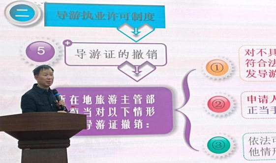 随后,郭家宏老师为大家介绍了如何成为一名优秀的英语导游。他首先从导游的语言分类出发,引导同学们了解导游相关知识,接着,给大家详细介绍了大学生报考导游资格证的流程,并提醒同学们当导游应注意的事项。