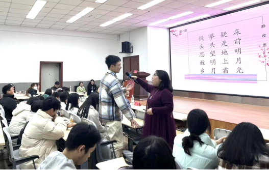 随后,邓毅以《诗经》《木兰诗》为例,进行了吟诵示范,并悉心指导学生如何应对诗句的停顿及其尾音的处理,解答同学们吟诵过程中的疑难困惑。邓毅生动形象、幽默风趣的讲解让在场师生感受到了吟诵所独有的魅力和韵味,激发了大家学习吟诵的浓厚兴趣。
