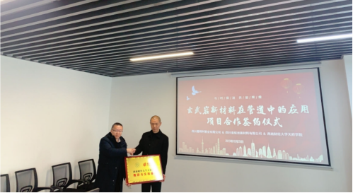 参观结束后,签约人员落座于创新中心501会议室,先就深化合作、人才培养、专业建设等进行了广泛交流,达成合作意向,并签署了项目合作协议。随后玄武岩研究院和四川都利得管业有限公司进行了授牌仪式。