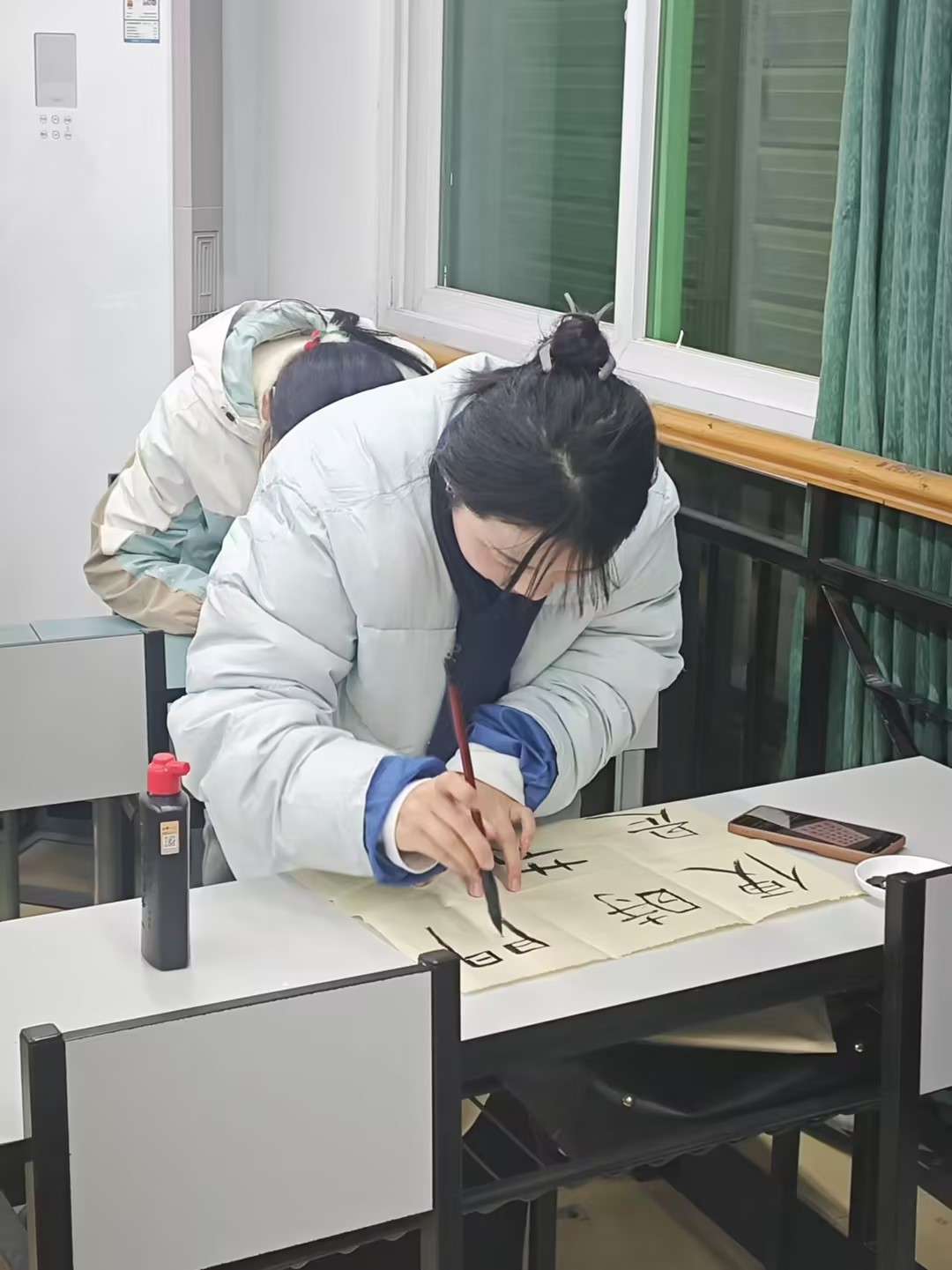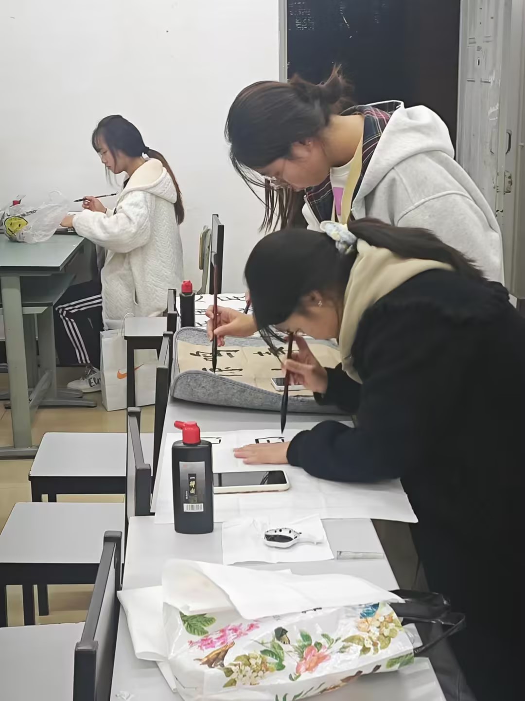 本次活动由文化与教育学院张玄老师指导、郑鑫荣同学担任学生负责人,围绕“汉字书写之美”展开。现场设置了技法讲解与沉浸书写两大环节。活动伊始,书法爱好者系统演示起笔、行笔、收笔及结构布局等基础技巧,并以“永字八法”为例,生动拆解书写逻辑,助力参与者快速入门。随后,同学们择取经典诗文或心仪词句,在宣纸上亲身体验笔墨流转的韵律之美。其间还安排了一对一指导,及时点拨、修正笔法。活动尾声,大家互赏作品、交流心得,于不同书风的对话中,共同感受书写带来的静心与满足。