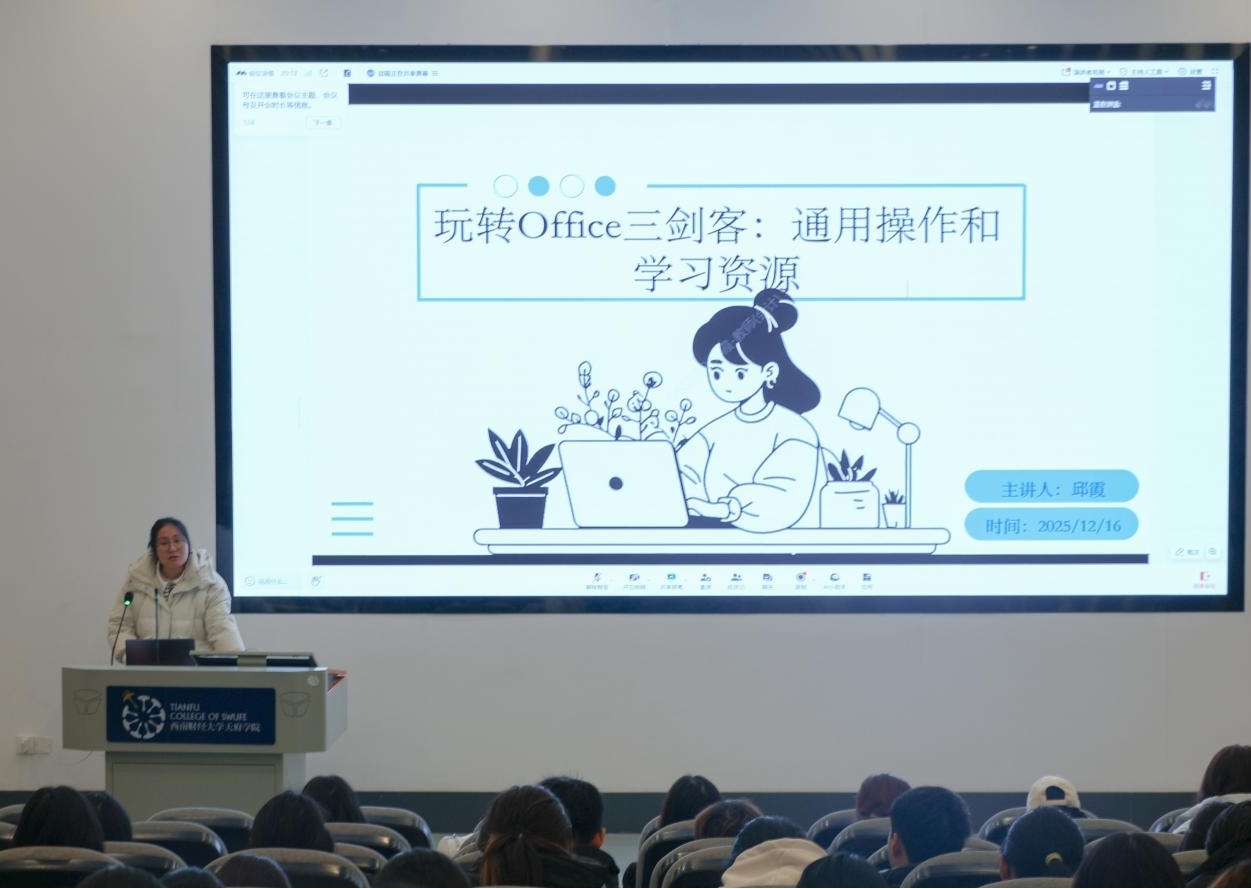 为帮助学生提升办公软件应用能力,西南财经大学天府学院会计学院班主任秘书处联合团总支、学生会学术部,于12月16日晚在德阳校区B101教室成功举办“班主任领航系列”之“玩转Office,办公效率倍增”专题讲座。主讲人邱霞老师凭借《财务机器人应用》《会计信息系统开发》等前沿课程教学经验,结合主持《财务数智化导论》课程建设的专业积淀,深度解析Office高阶应用技巧。本次讲座吸引了德阳校区240余名学子参与。讲座现场邱霞结合多年教学经验,...