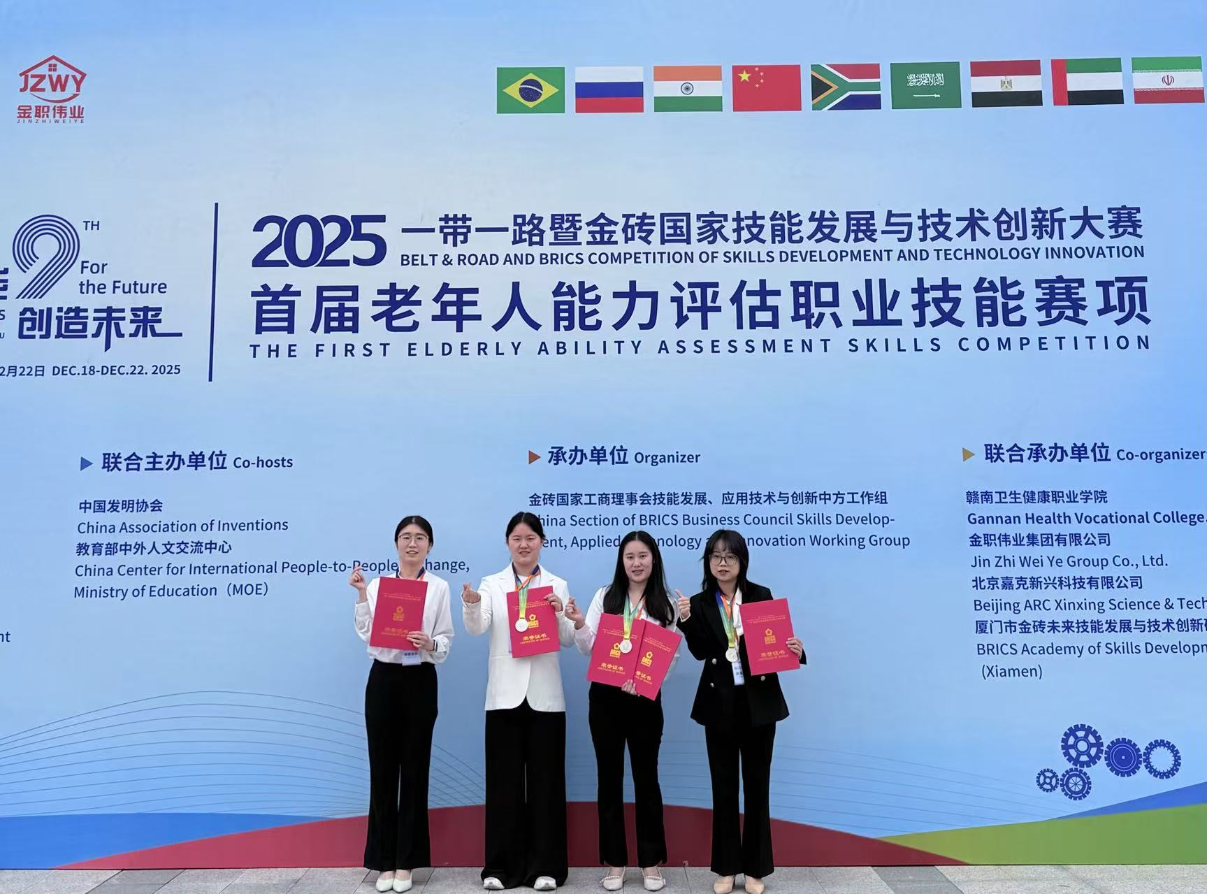 12月18日至22日,2025“一带一路”暨金砖国家技能发展与技术创新大赛首届老年人能力评估职业技能赛项在江西赣南卫生健康职业学院举办,学校康养护理学院教师贺家、姚雪梅、邓莉、廖诗沁组成的西南财经大学天府学院代表队参赛,最终斩获教师组二等奖,学校荣获优秀组织奖。开幕式现场首届老年人能力评估职业技能赛项设置综合知识测评与教学能力展示两大核心竞赛模块,全面考查参赛教师的专业素养与教学水平。备赛期间,参赛教师团队深入研究《...
