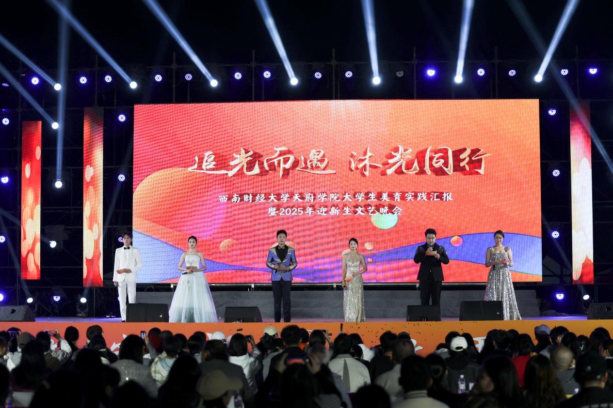 为迎接2025级学子开启校园新程,丰富校园文化建设、营造校园美育氛围,展现天府学子青春风貌,10月29日晚,西南财经大学天府学院“追光而遇,沐光同行”大学生美育实践汇报暨2025年迎新生文艺晚会在学校德阳校区足球场顺利举行。晚会节目涵盖舞蹈、合唱、器乐、川剧、舞台剧等多元艺术形式,用精彩演出编织青春画卷,为全体师生呈现了一场视听盛宴。校长蒲果泉,副校长张之明、钟成和校长助理高亮出席晚会,各二级学院、各职能部门主要领导和教职工代表同2000余名学生在现场观看了演出。