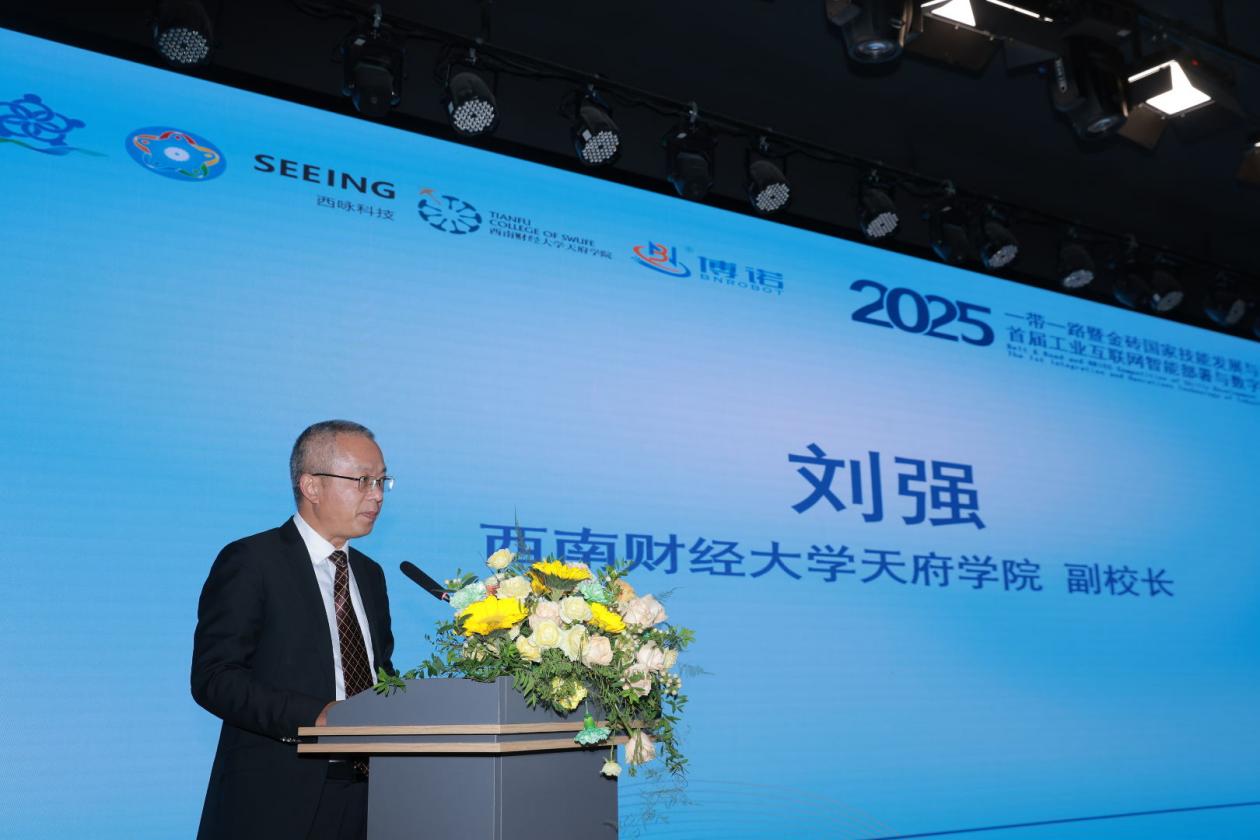 西南财经大学天府学院副校长刘强宣布大赛顺利闭幕。他对所有获奖选手和单位表示祝贺,向全体专家、裁判、指导教师、工作人员及各支持单位致以诚挚感谢。他强调,本次大赛搭建了金砖国家技能交流与技术创新的重要平台,未来将持续深化多方合作,推动技能人才培养与产业升级协同发展,为“一带一路”技能发展共同体建设注入更多动力,在工业互联网技能人才培养、技术创新等领域凝聚合力,为金砖国家技能发展与技术创新贡献高校力量。