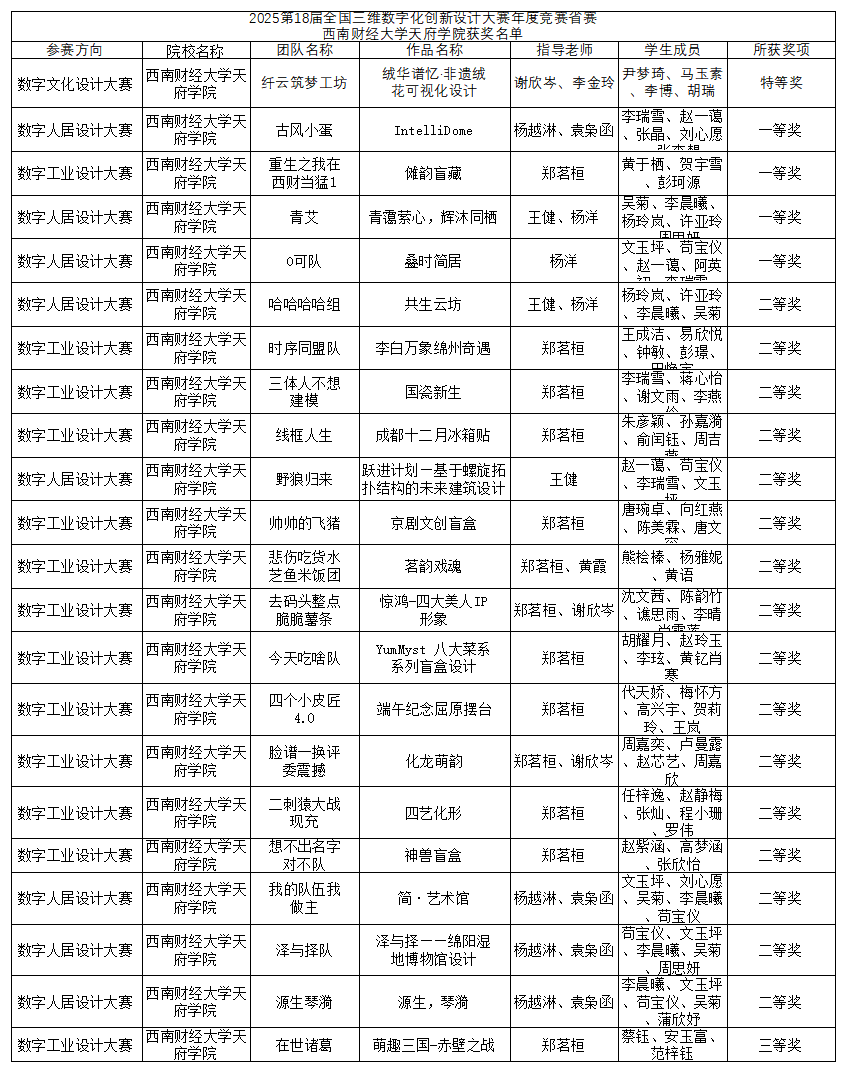 本次大赛由西财天府学院工程与材料学院牵头,积极组织各学院师生参加大赛,经历了初赛海选、省赛(复赛)的层层选拔和激烈角逐,最终经过省级初赛、复赛选拔淘汰,学校共取得省级特等奖1项、省级一等奖4项、省级二等奖16项、省级三等奖1项,共计22项荣誉佳绩。