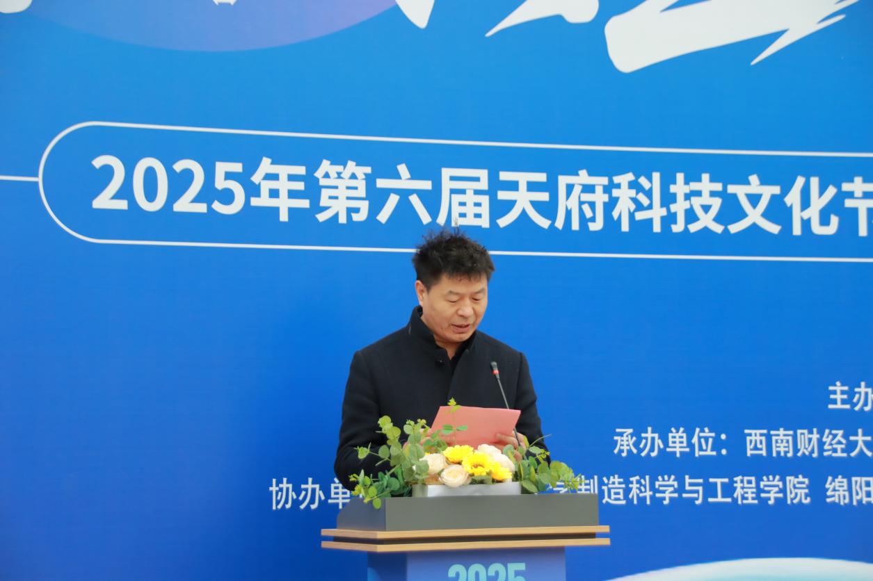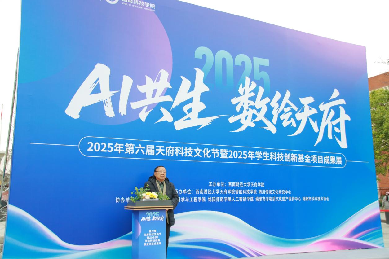 开幕式上,蒲果泉在致辞中强调了人工智能正深刻重塑产业格局与文化生态,科技与文化的深度融合已成为推动创新发展的核心驱动力。往届天府科技文化节不仅孵化出多项获省级、国家级认可的学生创新成果,更搭建起了“学、研、用”贯通的实践桥梁。此次第六届天府科技文化节以“AI共生 数绘天府”为主题,既是对科技赋能未来理念的深化,更是对服务地方发展、传承中华民族优秀传统文化使命的践行——希望同学们能以此次活动为契机,跳出学科边界,将人工智能技术与金融服务、文化传承、公共安全等领域需求紧密结合,在解决实际问题中激发创新潜能,让青春智慧在科技成果转化中发光发热。