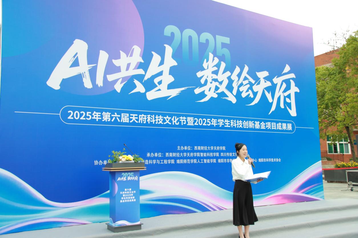 11月18日,西南财经大学天府学院绵阳校区光华广场上科技氛围浓厚、创意涌动——“AI共生 数绘天府”2025年第六届天府科技文化节暨2025年学生科技创新基金项目成果展在这里拉开序幕。此次活动由西南财经大学天府学院主办,学校智能科技学院和四川传统文化研究中心承办,西南科技大学制造科学与工程学院、绵阳师范学院人工智能学院、绵阳市非物质文化遗产保护中心以及绵阳市天府科技云服务中心共同协办,旨在深化产教融合,展示人工智能技术与多领域融合的创新成果,为全校师生带来一场科技与文化的盛宴。