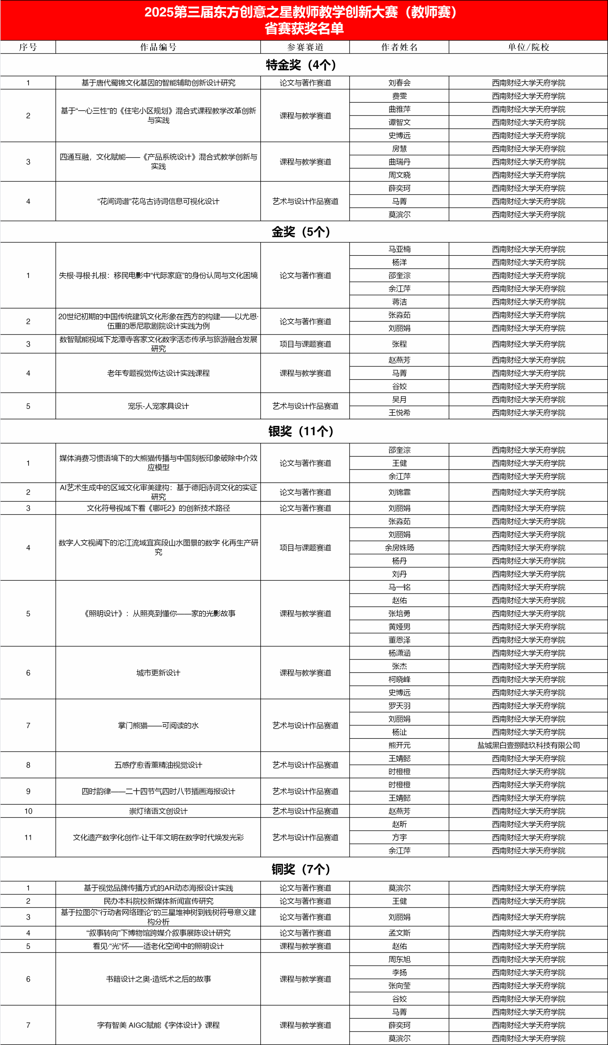 2025第三届东方创意之星教师教学创新大赛(教师赛)国赛获奖名单于近日公告出炉,西南财经大学天府学院艺术与传媒学院积极参赛,最终荣获金奖2项,银奖3项,铜奖4项,省赛(四川赛区)特金奖4项,金奖5项,银奖11项,铜奖7项。