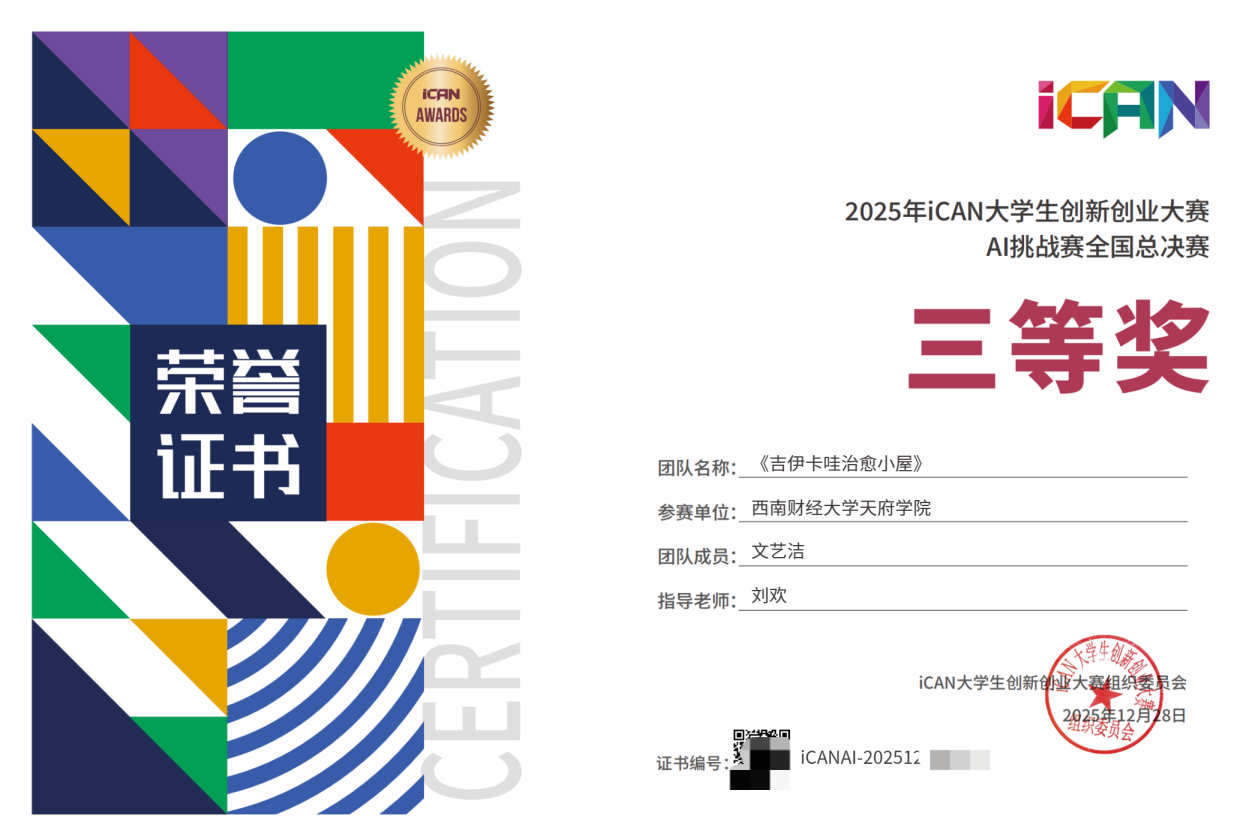 赛事通过多环节综合评定,全面考察选手的创新思维、AI技术应用与团队协作能力。天府学子凭借扎实的创新素养与出色的实践能力,在全国898支入围作品的激烈角逐中脱颖而出,王贞钦团队、侯思晗团队、蔡熙林团队凭借优异表现斩获3项全国二等奖,文艺洁团队、刘美伶团队荣获2项全国三等奖。