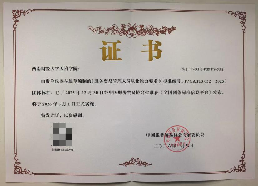 近日,由中国服务贸易协会组织起草的团体标准《服务贸易管理人员从业能力要求》(标准编号:T/CATIS 032—2025)经批准正式发布,并将于2026年5月1日起在全国范围内实施。西南财经大学天府学院智能金融学院作为该标准的重要参编单位之一,全程参与了标准的调研、起草与论证工作,为推动我国服务贸易行业人才规范化、专业化发展贡献了高校智慧与力量。