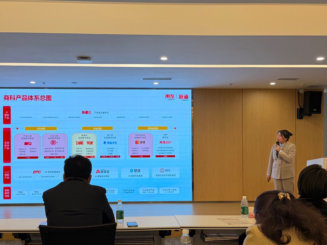 此外,新道科技四川分公司副总经理陈自洪对2026新道新商科产品体系及课程服务方案进行了介绍,并重点展示了人工智能背景下课程体系与教学资源的重构路径,为高校推进新商科专业建设提供了系统化支持方案。