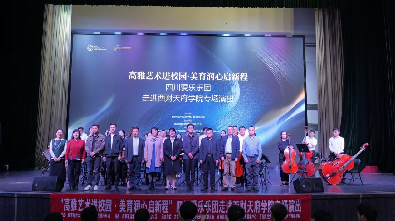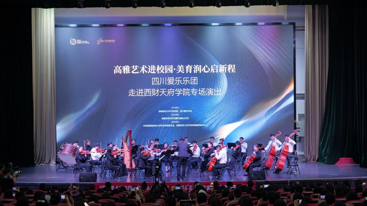 本次活动由西南财经大学天府学院与四川爱乐乐团联合主办,成都市成华区龙潭街道院山社区协办,共青团西南财经大学天府学院委员会、西南财经大学天府学院美育教学中心共同承办。校党委书记、省政府督导专员韩秀英致欢迎辞。她指出,美育是落实立德树人根本任务的重要载体。学校长期坚持构建以课程教学为基础、艺术实践为载体、校园文化为依托的一体化美育育人体系。本次专场音乐会是学校推动高雅艺术进校园的重要实践,旨在以乐润心、以艺育人,不断提升学生审美与人文素养,助力学生德智体美劳全面发展。