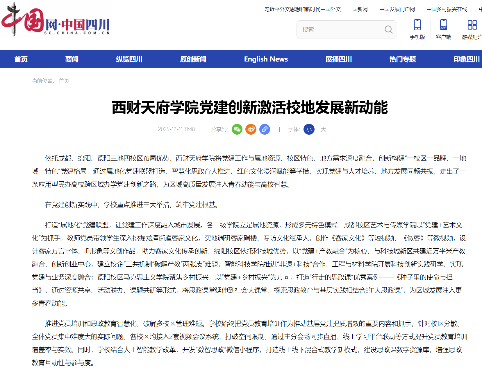 西财天府学院通过差异化定位、数字化赋能、实践性导向的党建创新路径,有效破解跨区域办学管理难题,实现党建成效与人才培养、地方服务的双向转化。下一步,学校将持续深化“在地化”党建探索,推动高校与城市共生共荣,彰显新时代民办高校党建的使命担当。(供稿:西南财经大学天府学院罗文)