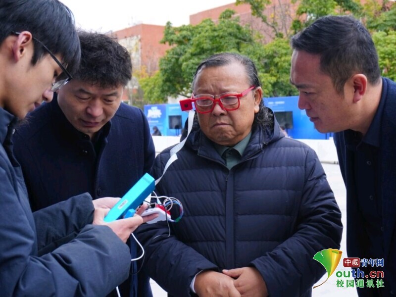 图为同学为西南财经大学天府学院校长蒲果泉试戴AI眼镜。李馥君 供图