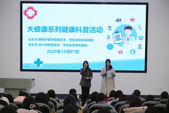 为帮助学生树立科学的健康观念,提高身体健康水平,12月7日,西南财经大学天府学院康养护理学院团总支、学生会科技实践部联合会计学院于德阳校区B101开展以“天使展翅,健康科普”为主题的大健康系列健康科普活动。活动由康养护理学院学生沈秘、江阳主讲,学生王三燕、毛晓悦主持,康养护理学院、会计学院学生踊跃参与。