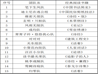 初赛阶段,通过对各团队阅读计划提交与完成情况、阅读宣传与分享效果等进行评选,15支团队被评为优秀,进入复赛。