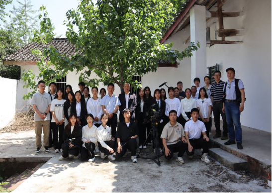 学校师生代表和上海电视台摄制团队在黄继光故居的梨树下合影