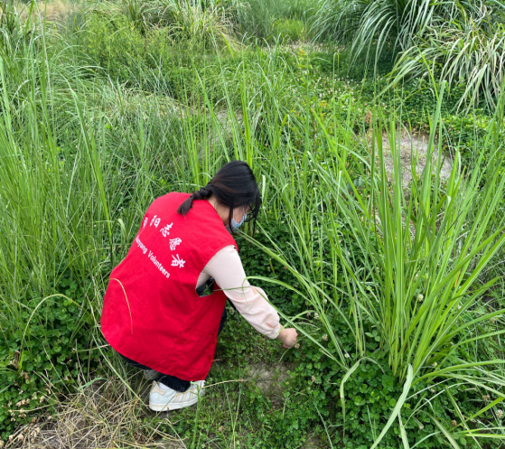 志愿者在清理草丛里面的烟头