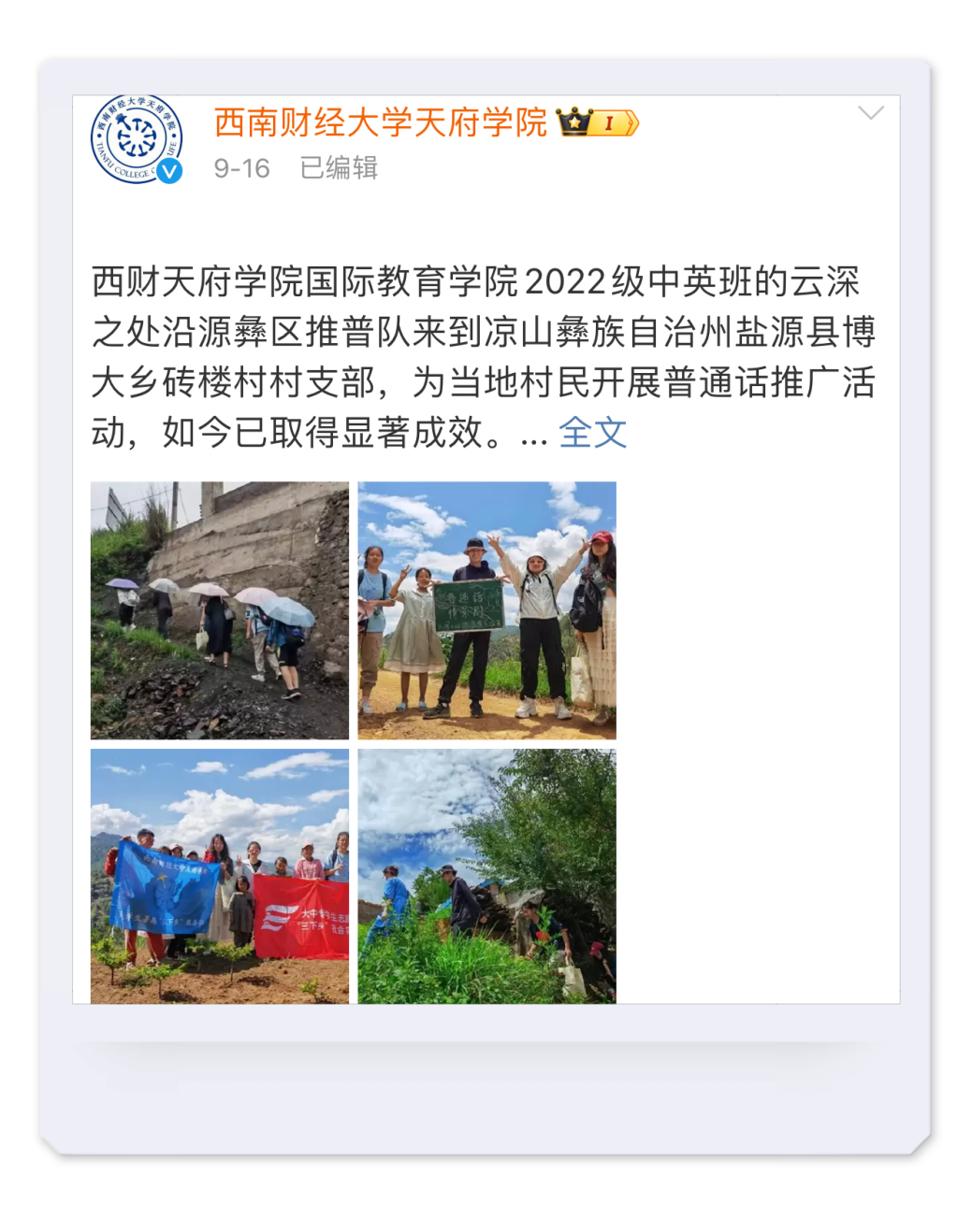 为进一步推广普通话的应用,学校组织开展了一系列特色鲜明、形式多样的推普活动。图书馆、各学生社团以及各班级纷纷响应号召,开展诵经典、读书会、诗歌节、演讲比赛等相关活动。学校官方微信公众号、官方微博等新媒体平台都对普通话进行了推广,对极易误读的词语等进行了普及。在一次采访中,一位2023级新生对校新闻宣传中心天府记者团成员说:“在农村长大的我,日常都说方言,一直觉得没什么。直到来到大学,遇到天南地北的同学,在交流中才发现普通话这么重要,也才意识到平常读错了这么多字,接下来我要着手准备全国普通话等级考试了!”