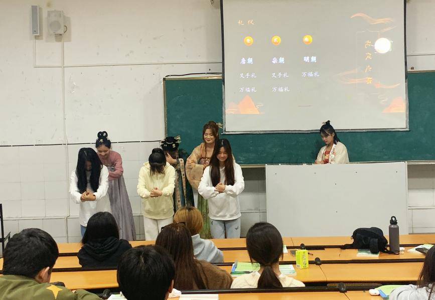 展示小组主要从走进汉服、街头采访、热点链接、实践体验、文化传承五个方面进行了分享。走进汉服环节,小组结合国风大典等视频分享了汉服的历史演变背后折射的不同文化内涵、价值观念、审美理念等。街头采访环节,小组通过课前去成都龙潭水乡、文殊院等地调研,了解大众如何看待“汉服热”现象,形成调研采访视频在课堂上播放。热点链接环节,小组以洛阳汉服火爆出圈为例分析出圈原因以及洛阳因时而变的文旅融合发展情况。实践体验环节,小组成员介绍各自所穿汉服的特点,并与同学开展互动,一起体验不同朝代的礼仪文化。文化传承环节,小组结合教学专题“继承优良传统 弘扬中国精神”内容,指出当代青年要尊重和传承中华优秀传统文化,以时代精神激活中华优秀传统文化的生命力,推进中华优秀传统文化创造性转化和创新性发展。