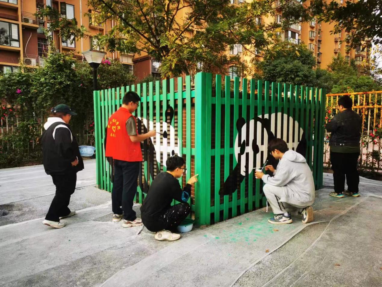 活动前期,支部学生深入了解当地文化特色,以熊猫为基本元素,同时融入绿色环保的发展理念,设计出了一系列具有当地文化特色的绘画底稿。在墙面绘制的过程中,小组成员分工明确,经历了底稿制作、勾线描边、图案配色上色和清扫工作,展现出了精益求精的精神,完成了人民塘社区多个围栏的绘制工作,实现了“颜值”和“内涵”双提升。活动赢得了前来参观的社区领导和居民们的广泛好评,结束后,他们都纷纷表达了对志愿者的赞美。