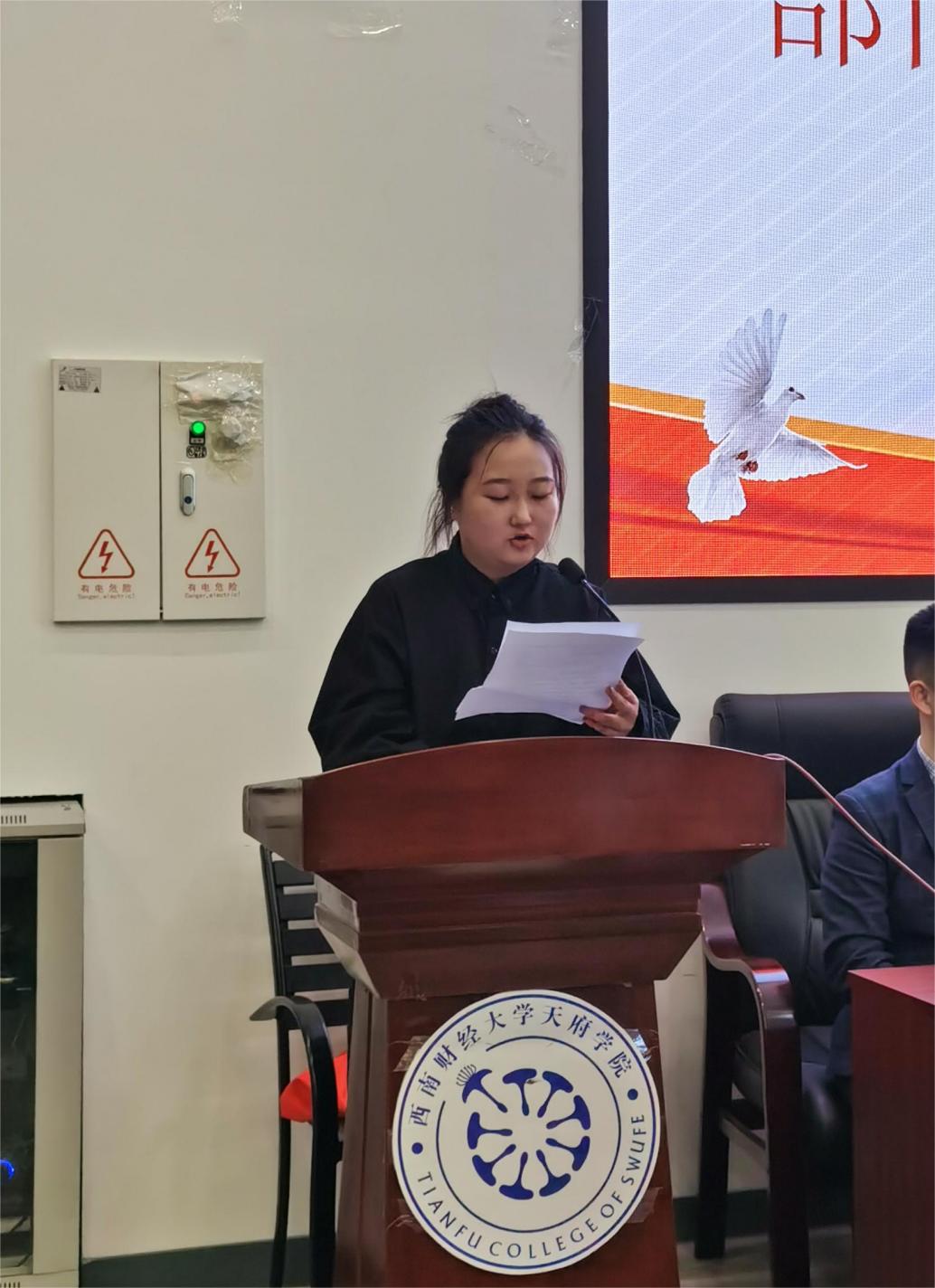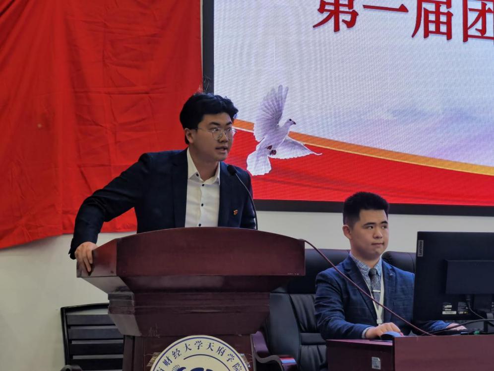 国际教育学院直属党支部书记詹议同志发言。詹议同志代表本次共青团西南财经大学天府学院国际教育学院第二次代表大会作总结发言。在发言中詹议同志代表学院党支部对本次大会的召开表示祝贺,并且对广大的青年学子表示问候。她表示“青年强,则国家强”青年人是国家的未来,是民族的期望;在未来的发展历程中国际教育学院团总支必将是一个有理想、敢担当,刚毅有为的团队。